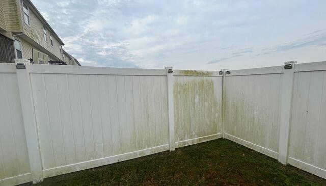 The vinyl fence around this home was covered in green grime, leaving it looking dull and dirty. Using our eco-friendly cleaning solution, we removed the buildup and made the fence bright white again.